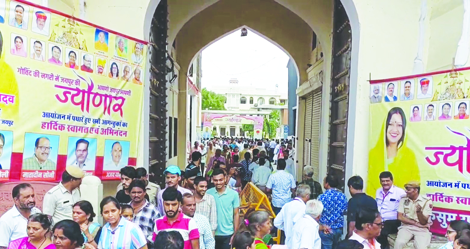 जयपुर में रविवार को गोविंद देवजी के भक्तों के लिए 110 साल बाद 'ज्यौणार' की रियासतकालीन परंपरा को फिर से जीवंत किया गया। सांगानेरी गेट स्थित अग्रवाल कॉलेज परिसर में 50 हजार से अधिक श्रद्धालुओं को दाल-बाटी-चूरमे का भक्ति प्रसाद परोसा गया। इस ऐतिहासिक आयोजन में संत-महात्माओं से लेकर आमजन तक ने साथ बैठकर प्रसाद ग्रहण किया Read More